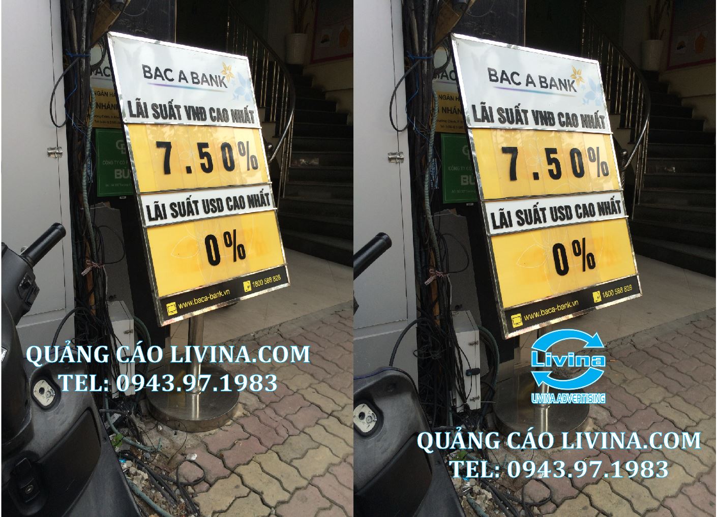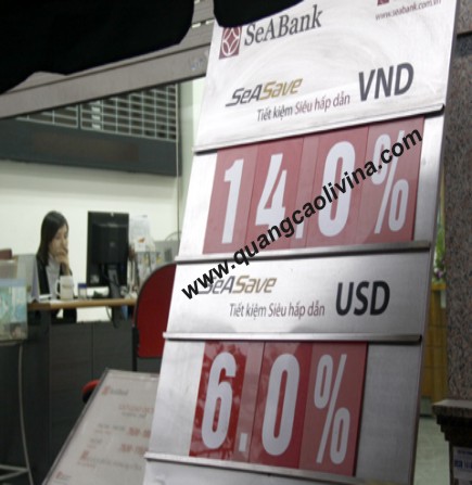 QUANGCAOLIVINA là đơn vị chuyển cung cấp các sản phẩm làm từ mica nhận làm biển lãi suất ngân hàng. Chúng ta có thể bắt gặp các biển lãi suất ngân hàng ở trước cửa của các ngân hàng với những con số lớn để khách hàng nhìn thấy mức lãi suất ngày cao nhất thu hút sự chú ý của khách hàng đến giao dịch nhiều hơn.