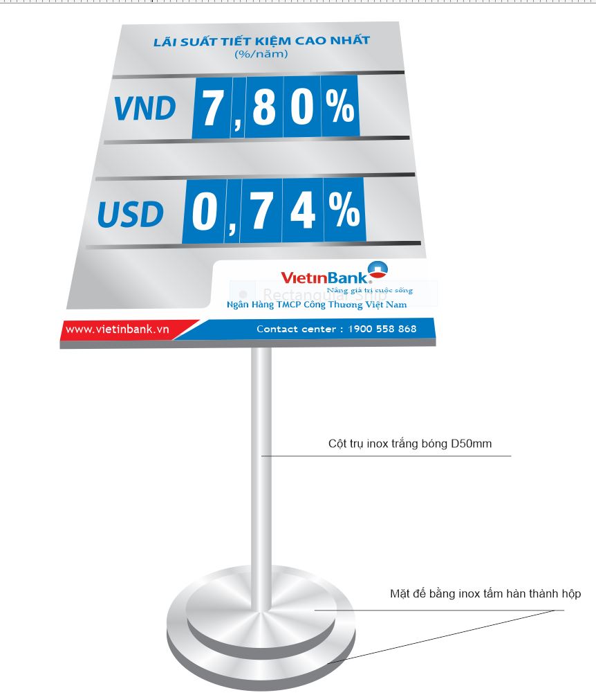 -Chân làm bằng cột inox tròn, giá đỡ của biển lãi suất ngân hàng  được làm bằng khung đỡ inox, có đế tròn được gia công có lực chịu được trọng lượng của cả bảng lãi suất.